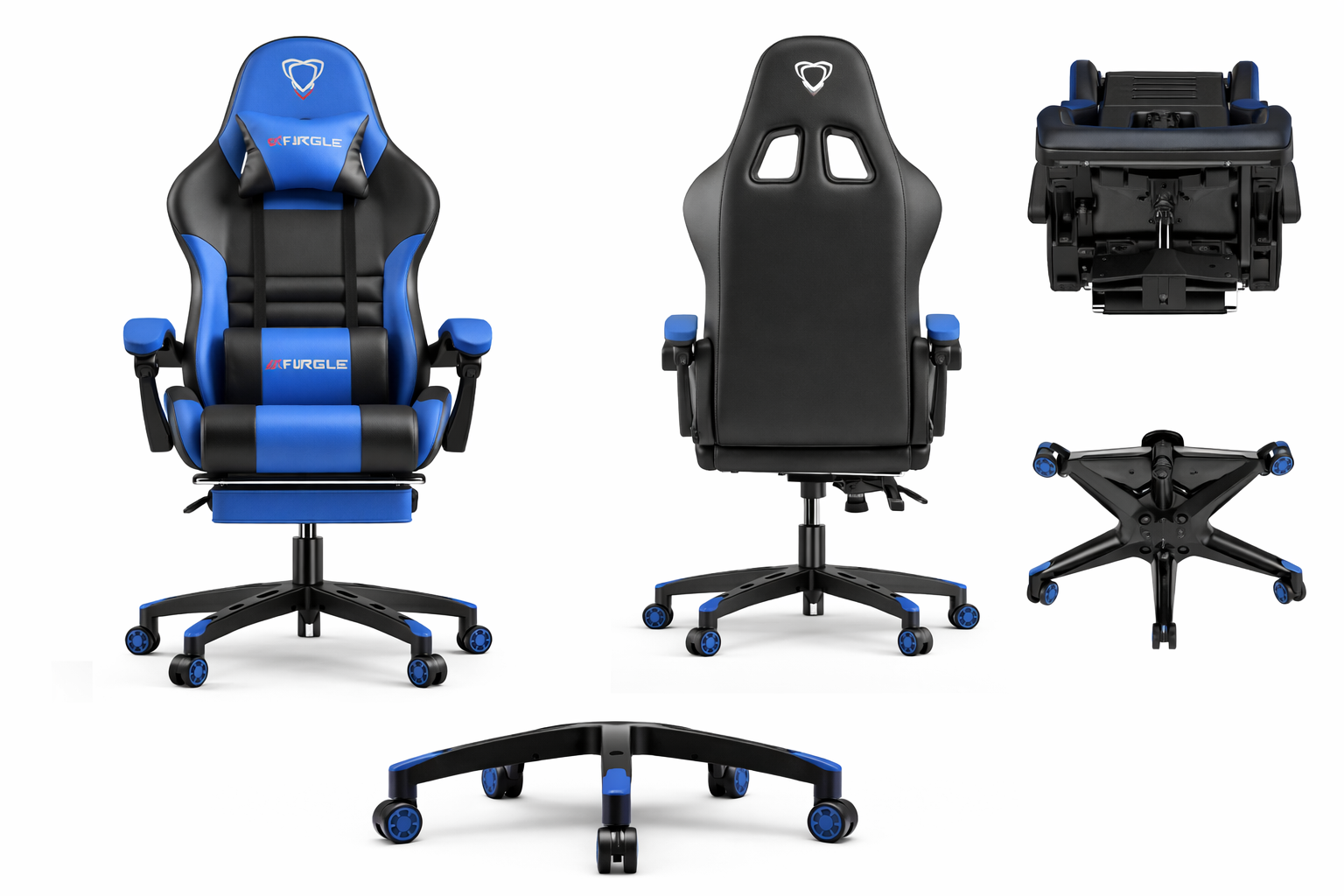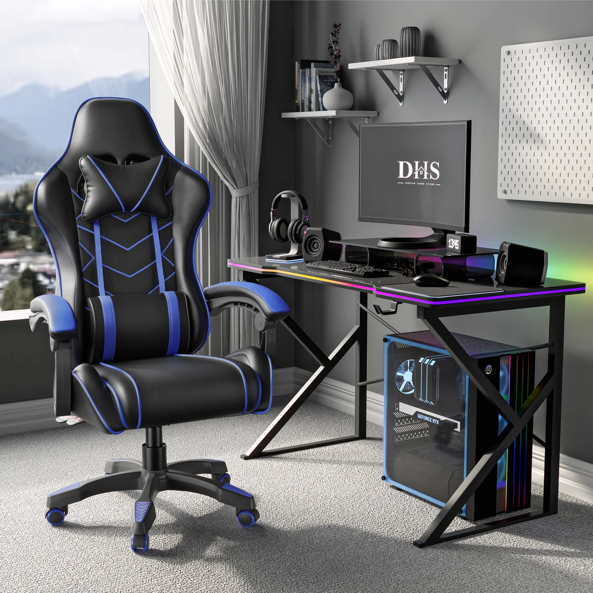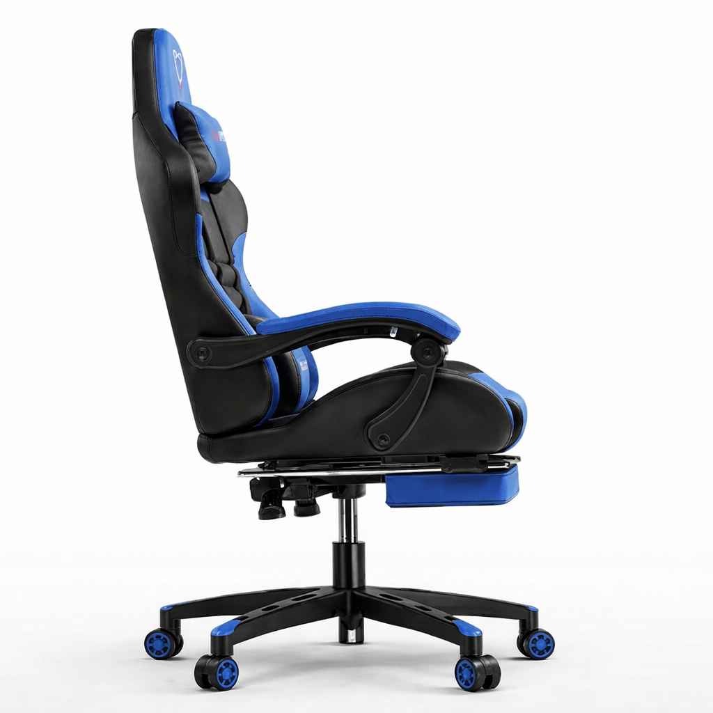 Ergonomic blue & black gaming chair designed for maximum comfort and support during long gaming or work sessions. Features a reclining backrest, adjustable height, and lumbar support to improve posture and reduce fatigue.